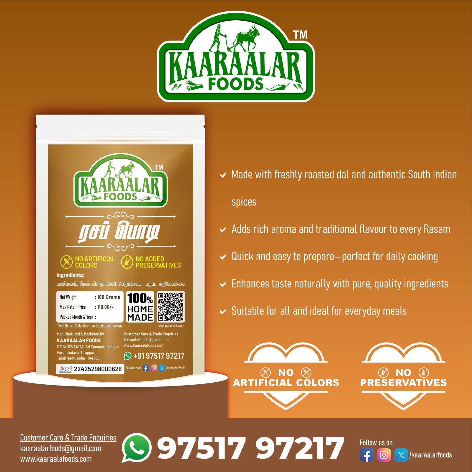Enjoy the comforting taste of homemade rasam with Kaaraalar Foods Rasam Powder, a fragrant blend of carefully selected spices prepared using traditional methods. Perfectly balanced for tanginess, spice, and aroma, this powder brings authentic South Indian flavor to every meal.
